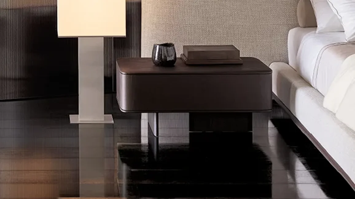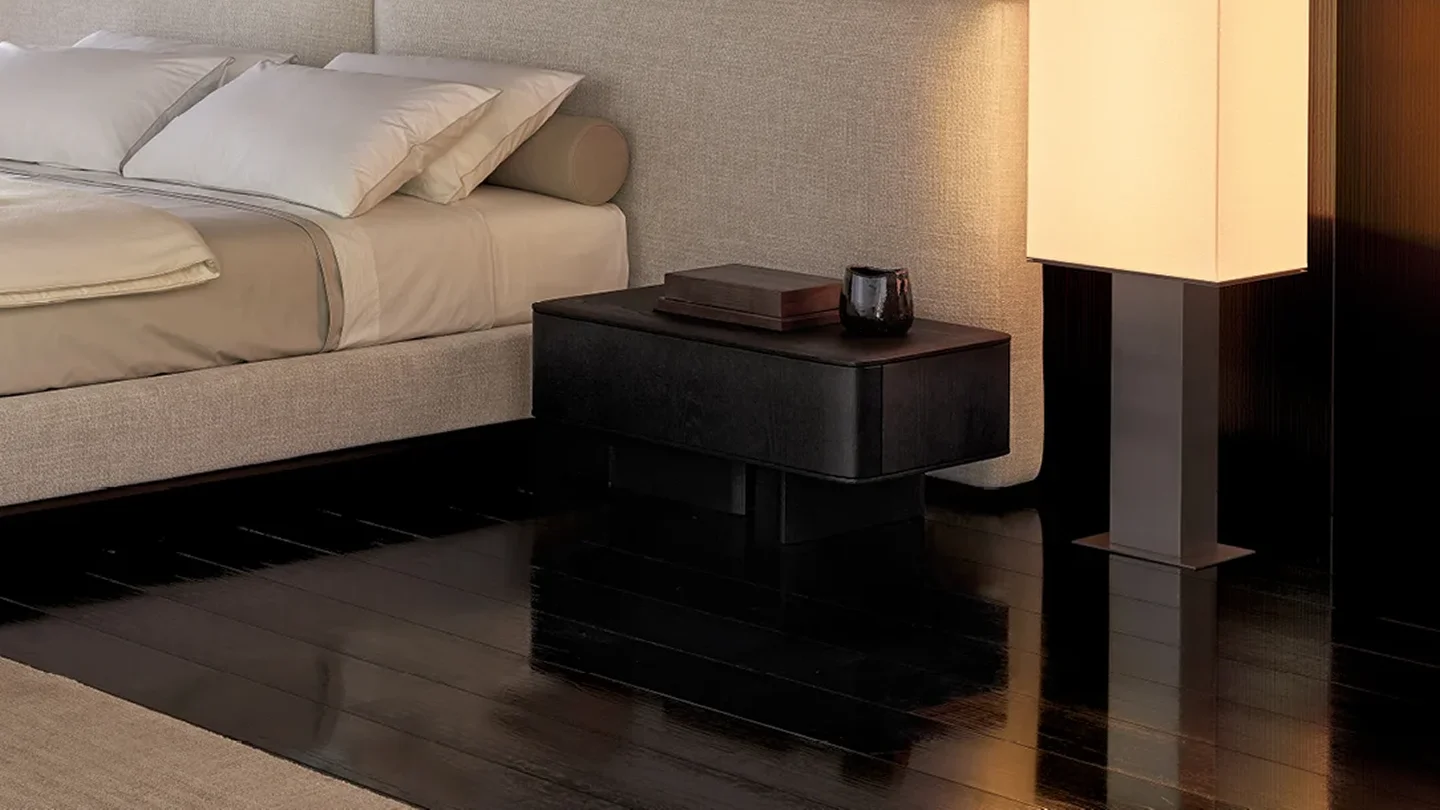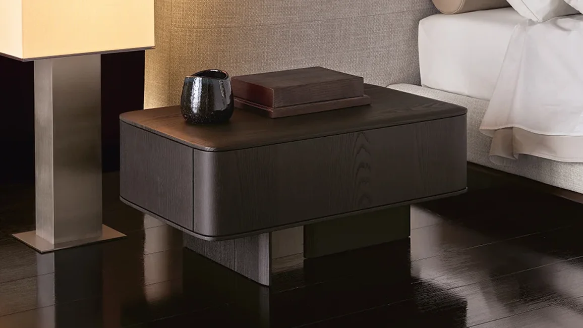 The Brera bedside tables take up the horizontal lines and the architectural inspiration of the bed of the same name. Available in two sizes, designed to be also contained within the larger headboard, they are enhanced by a drawer and embellished with sophisticated finishes such as marble.