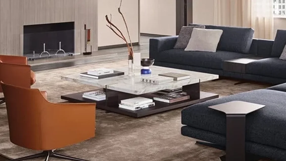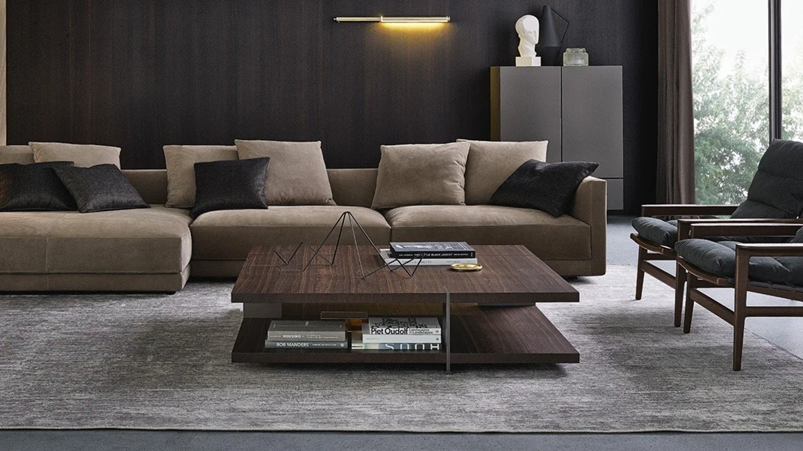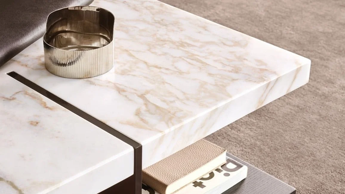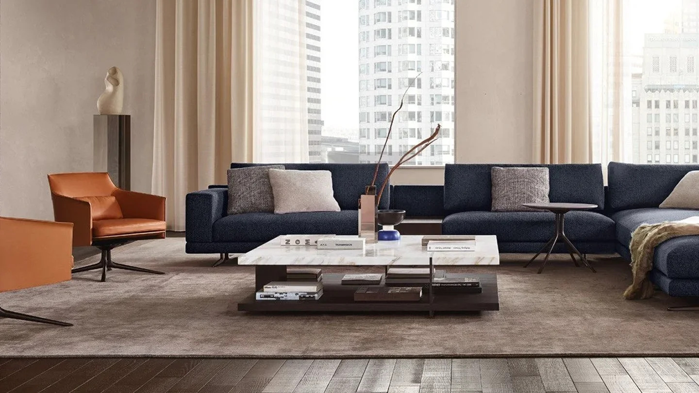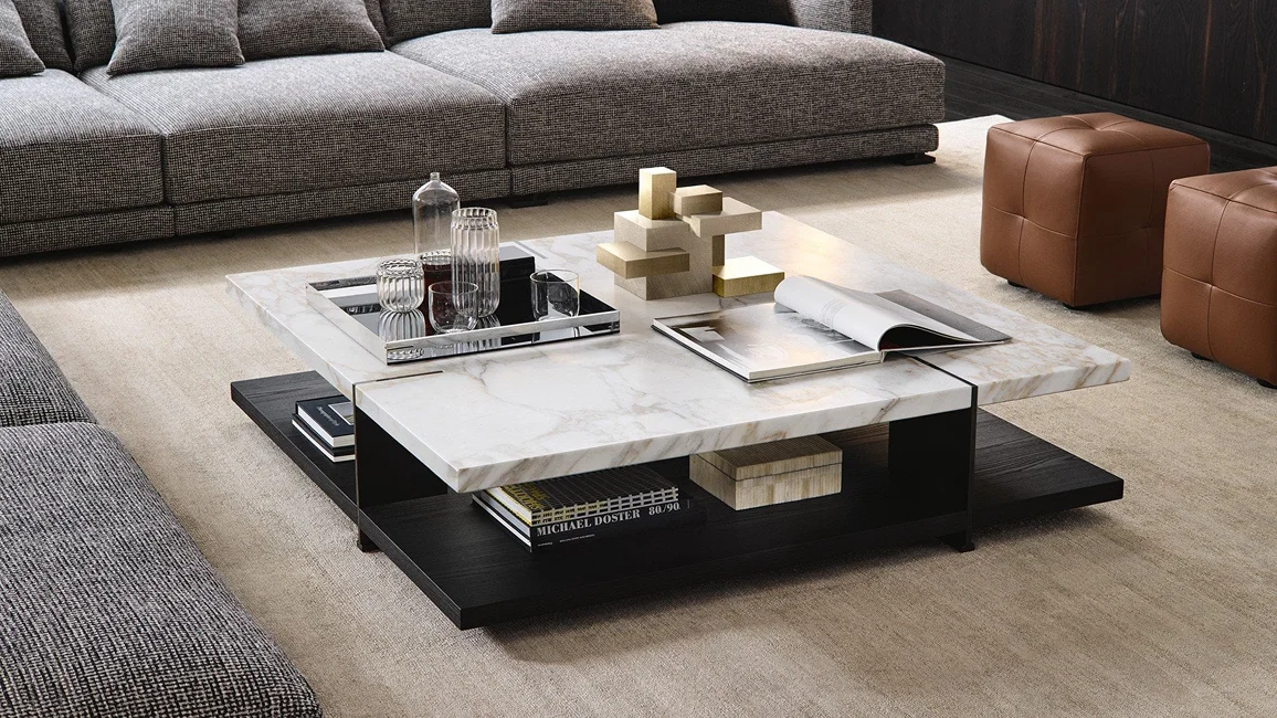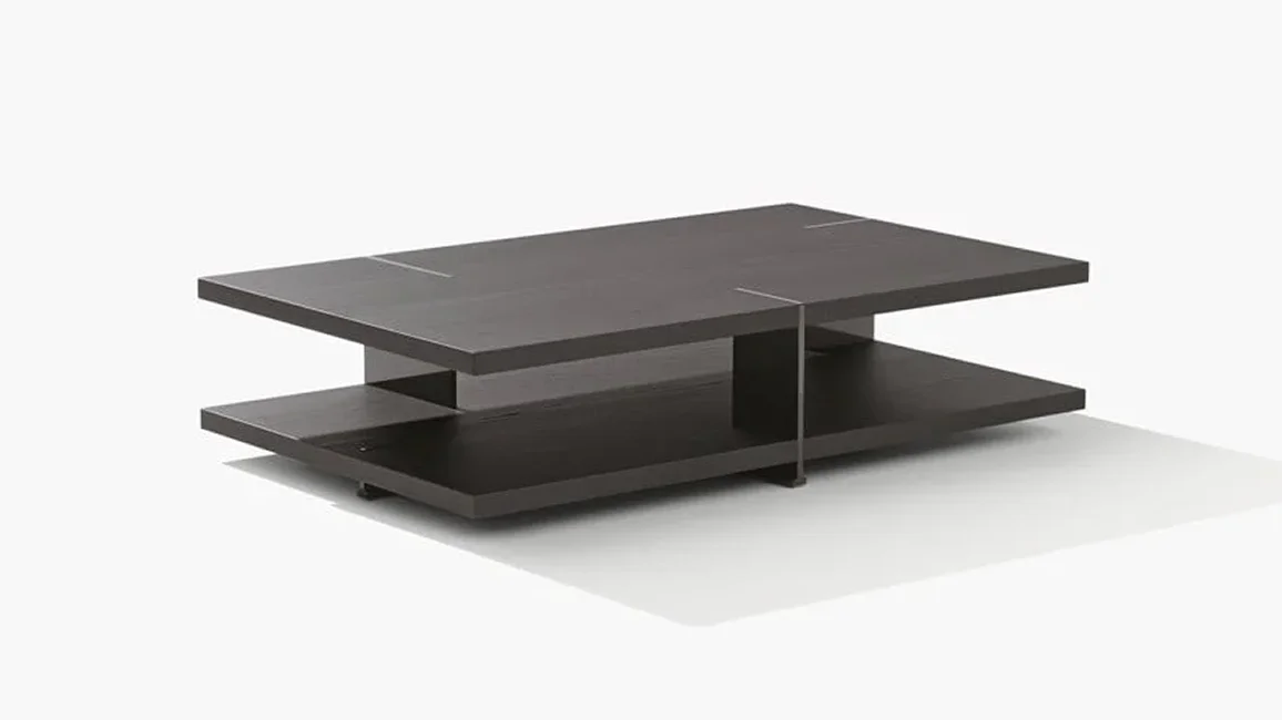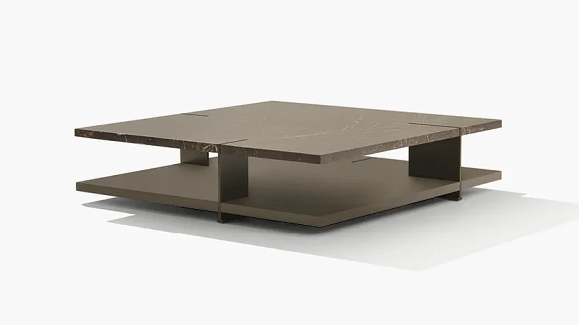 To complete the Bristol collection, consisting of sofa, book-case, and sideboard, there are also the centre coffee tables, characterized by two planes on top of each other. Metal supports intersect the upper top, becoming the signature style of the entire collection. The lower plane is available lacquered or in wood, the upper one also in marble.