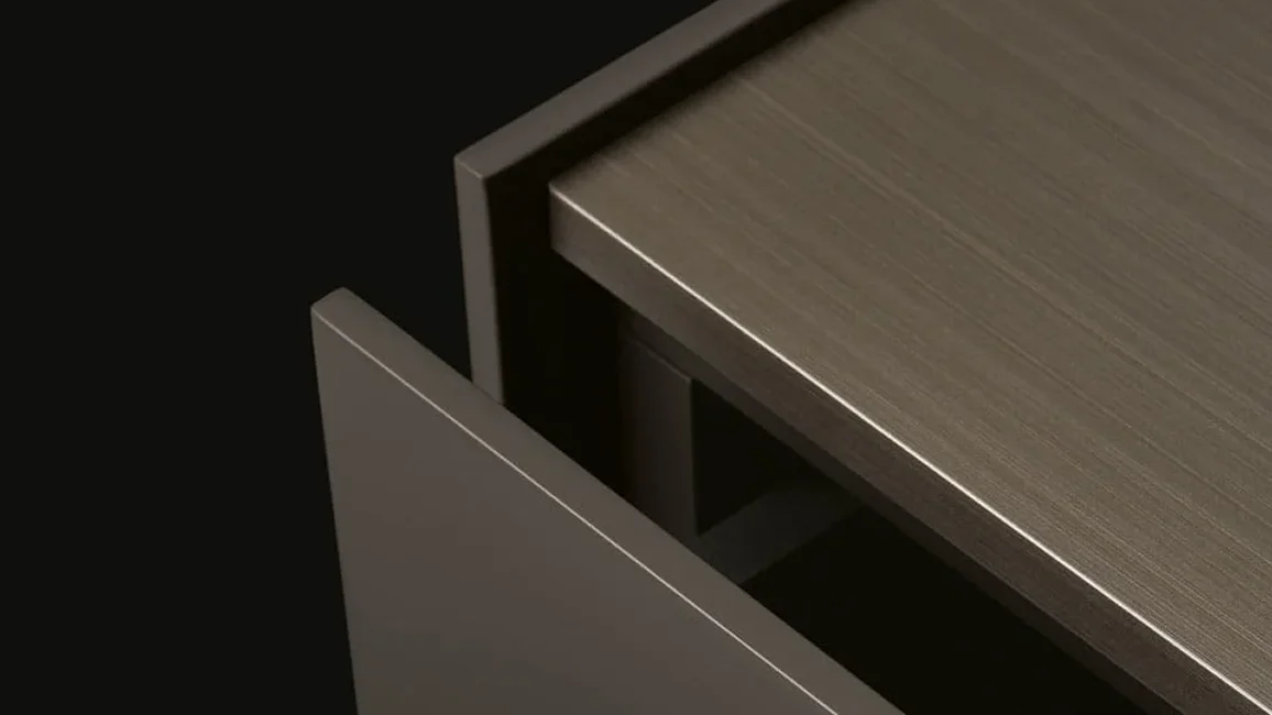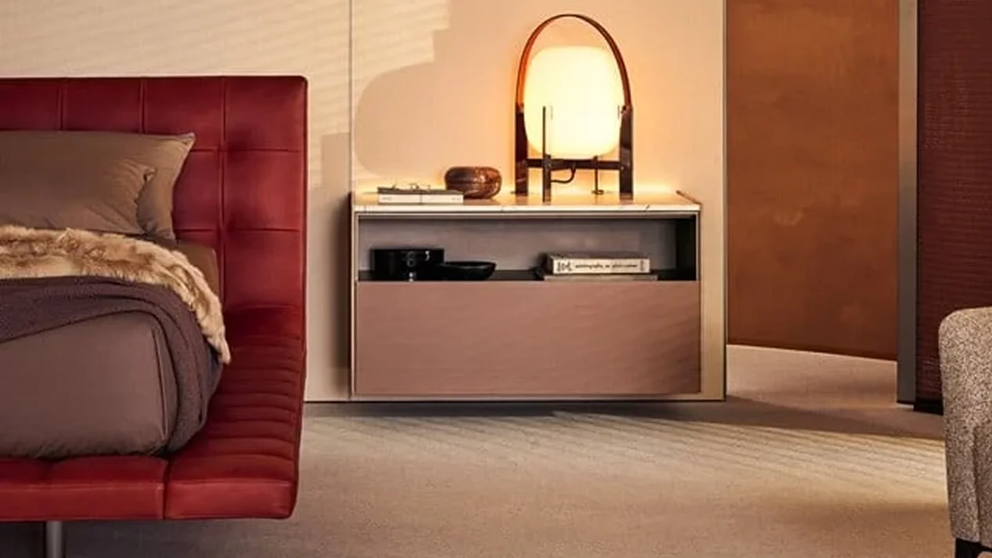 The versatile design of the Code system extends to the bedroom area. In the area dedicated to rest and relaxation, the containers function as bedside tables or chests of drawers, available both in the suspended version and in a free-standing version with a metal plinth.