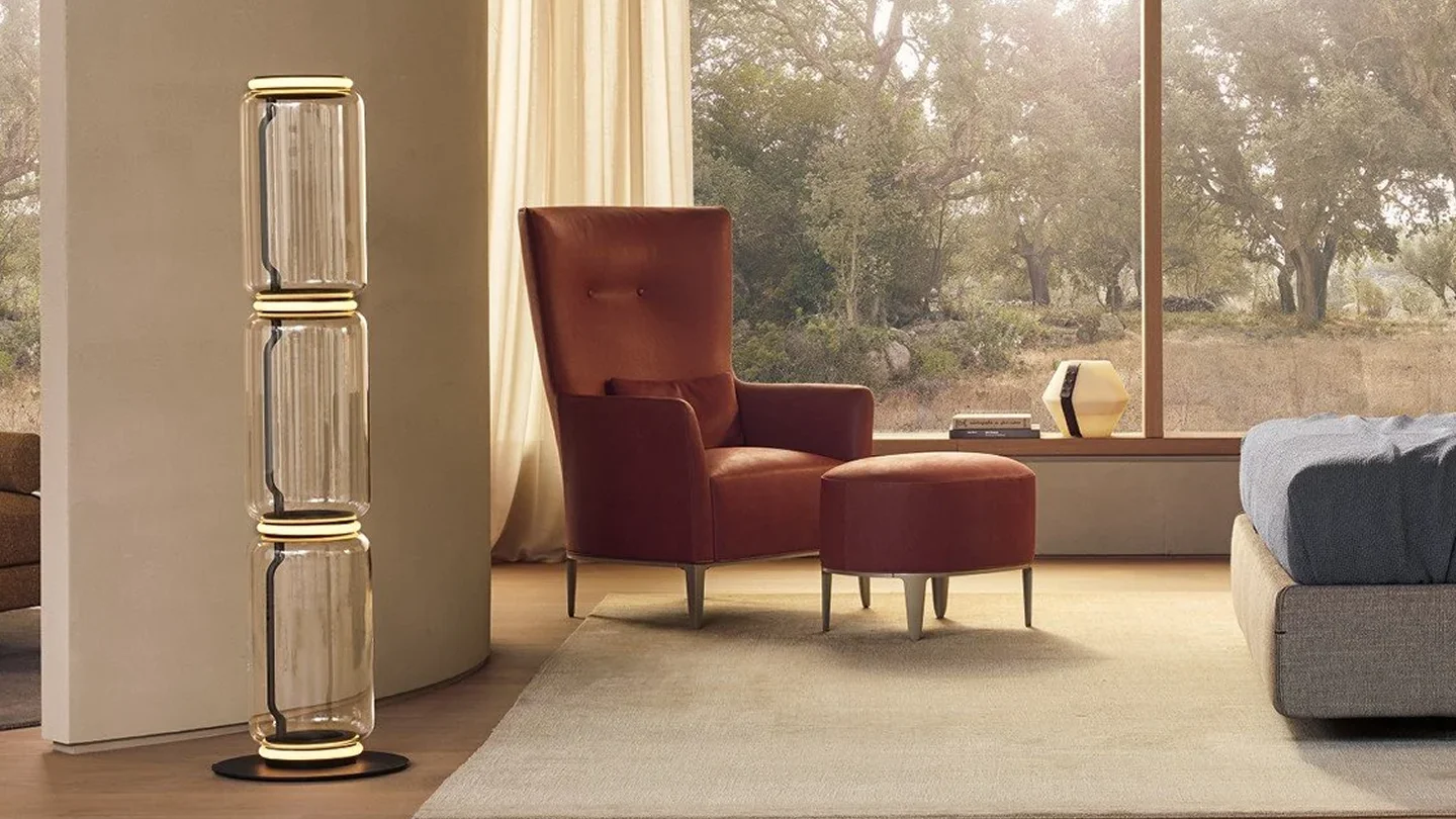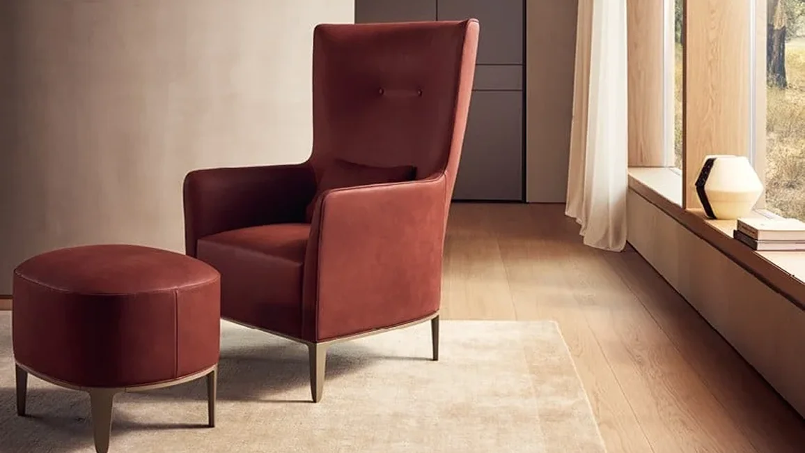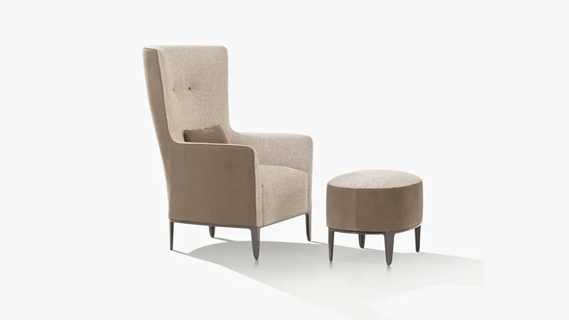 The Gentleman Reserved armchair is the most unusual out of the Gentleman collection. This is due to the high backrest with buttons reminiscent of a cigar lounge. What makes this model even more exclusive is the possibility of combining two different finishes for the interior and exterior upholstery. Gentleman Reserved can be completed with a pouffe, a useful and elegant accessory that enhances the armchair’s comfort.