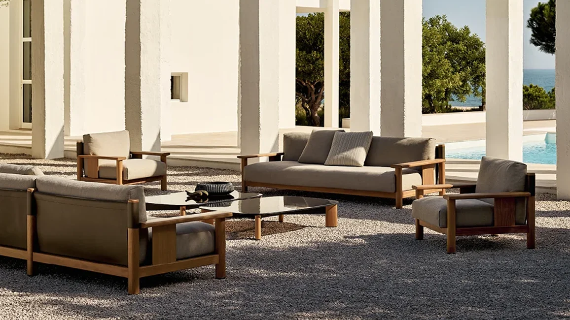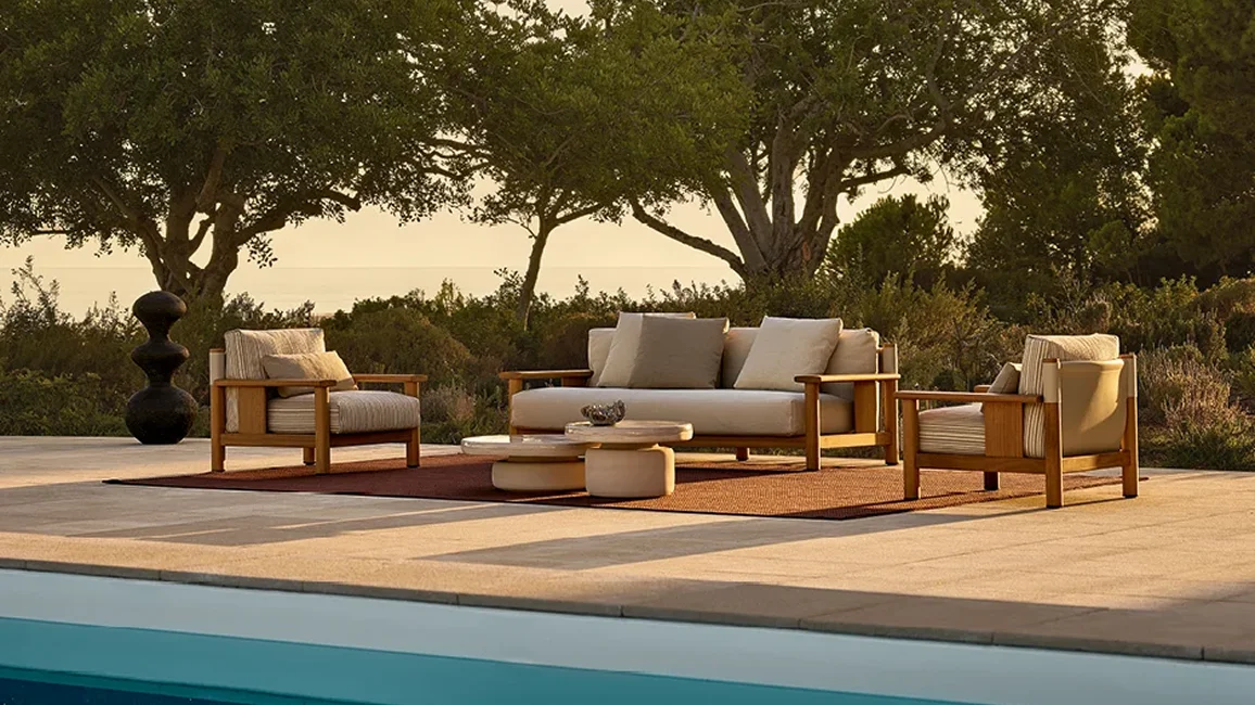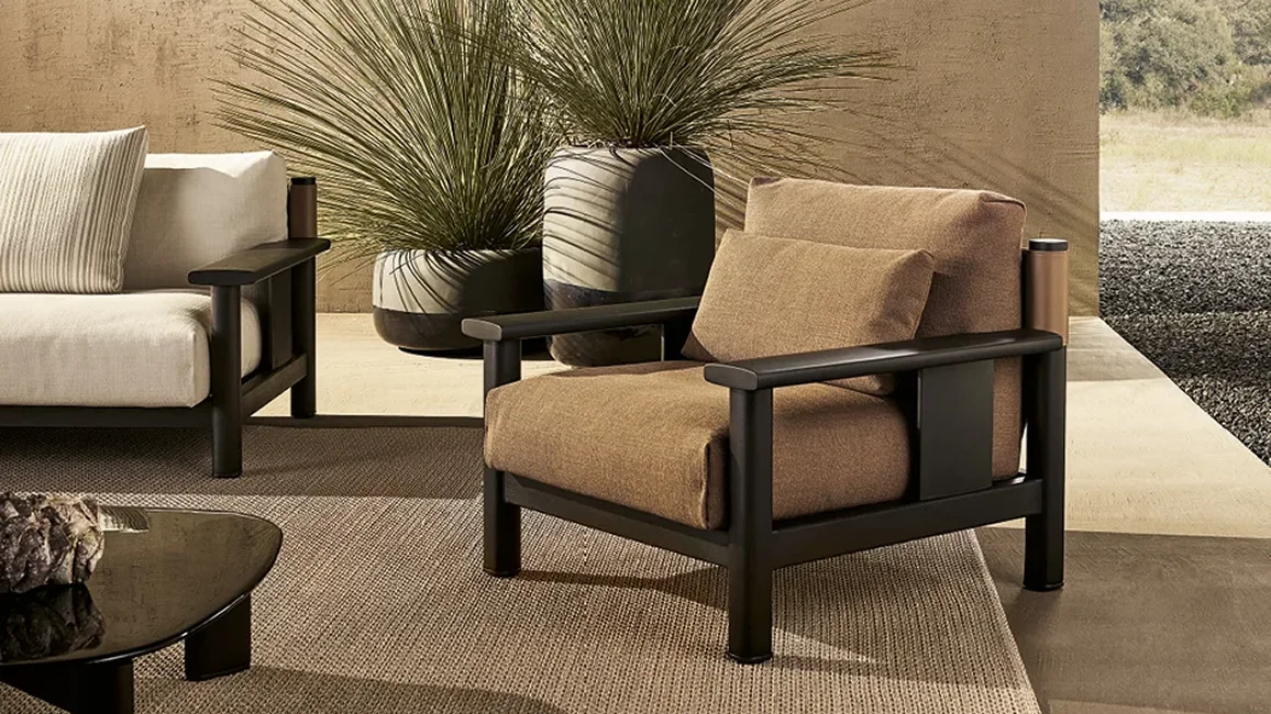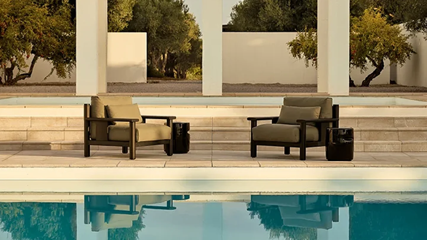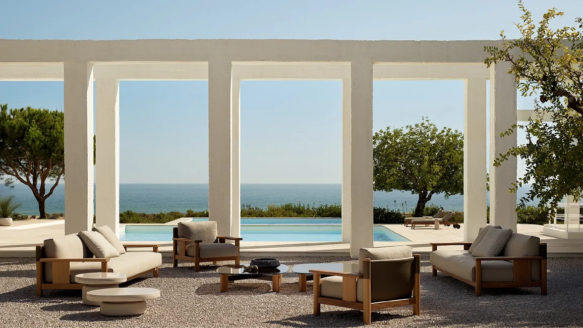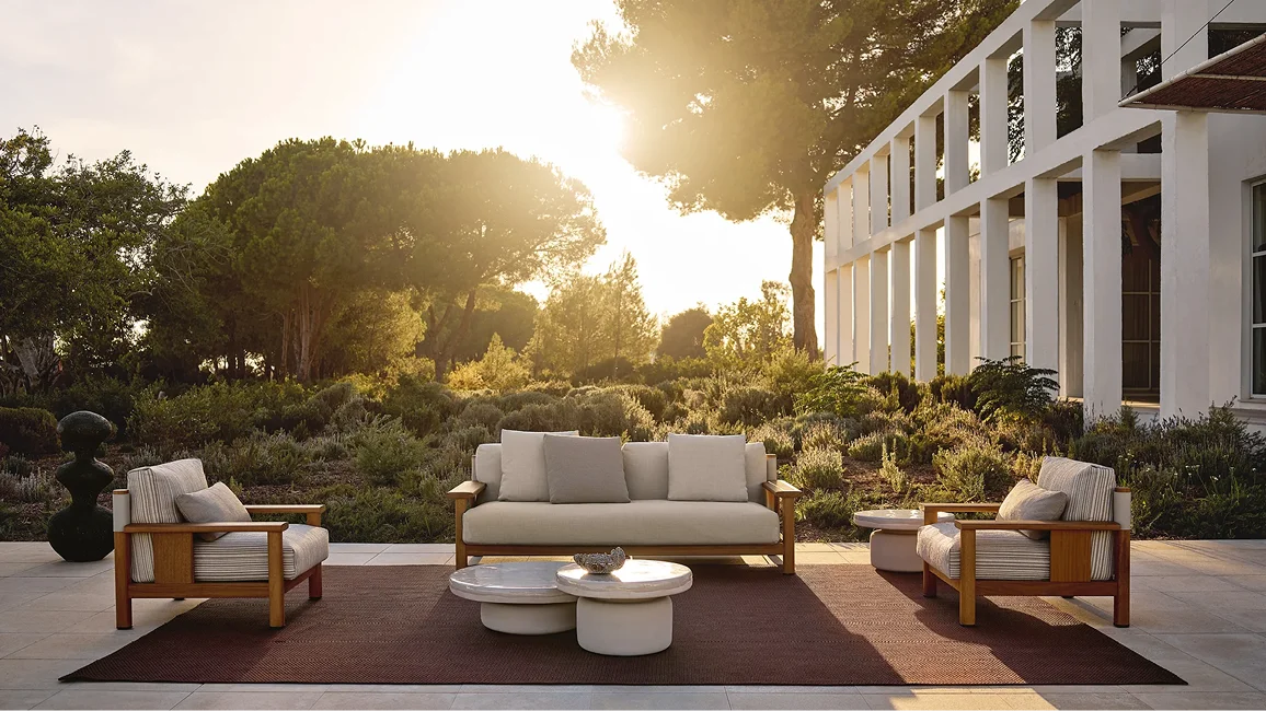 Solid lines and generous volumes for a seat inspired by the nautical world. With the Ketch armchair, the essential solid iroko wood structure is coupled with a flexible backrest that resembles a sail stretched between the two masts of a boat. Bursting with character when used individually, the armchair is part of a larger collection consisting of a sofa and coffee table.