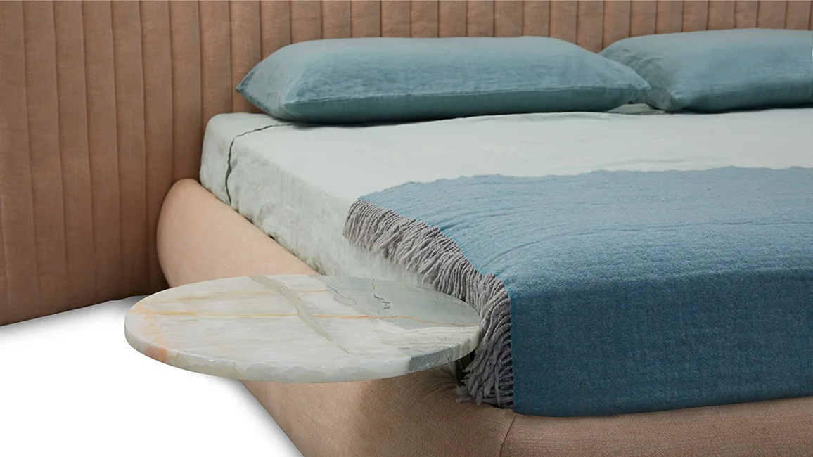 Elegant support surfaces with the function of a bedside table in fine onyx, can be reorganized along the perimeter of the sommier, satisfying different needs.